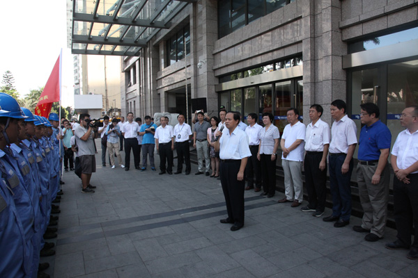 下午3时,海口第三批电力抢修队60人在海南电网公司广场前集结,即将开赴临高支援灾后电力抢修。刘赐贵来到队伍中间,和大家亲切握手,给大家鼓劲加油。随后,他来到电网电力调度控制中心,了解全省实时电力调度和电力设施度汛情况。在应急指挥中心,他与受灾最严重的儋州、临高、东方、昌江、白沙、乐东等6市县供电部门视频通话,勉励大家不畏艰难,奋勇拼搏,加快抢修。