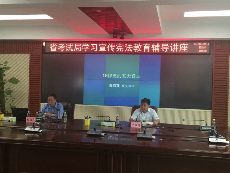 5月16日下午,省考试局在办公楼五楼会议室举办了学习宣传宪法教育辅导讲座。讲座的主题是“18修宪的五大看点”,由中共海南省委党校(省行政学院、省社会主义学院)原党委书记、常务副校长彭京宜教授主讲。讲座由副局长、局机关党委书记卢贵清主持。